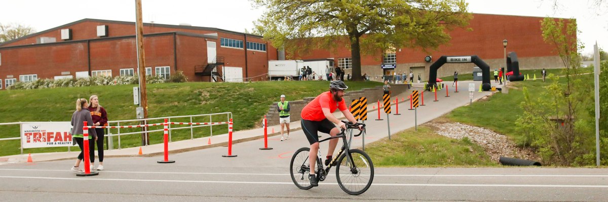 The event begins with a 150 Yard swim at the Truman State University Natatorium, followed by a 9 mile bike ride that is two loops on the city streets in Kirksville and ends with a 2.4 mile run on mostly sidewalks through and around the edge of campus.