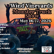 Get ready for the wildest, funnest, most exciting event our region has ever seen with the 3th annual Monster Truck Show at Wind Vineyards SML! This event was a major hit the last year! 3 world class monster trucks*, mini monster truck action, professional lawn mower racing, children's Power Wheels competitions, a monster ride truck, as well as bounce houses, slides, games, and fun activities for kids! The line up and times are scheduled to be the same for both show dates, Saturday May 16 and Sunday May 17!